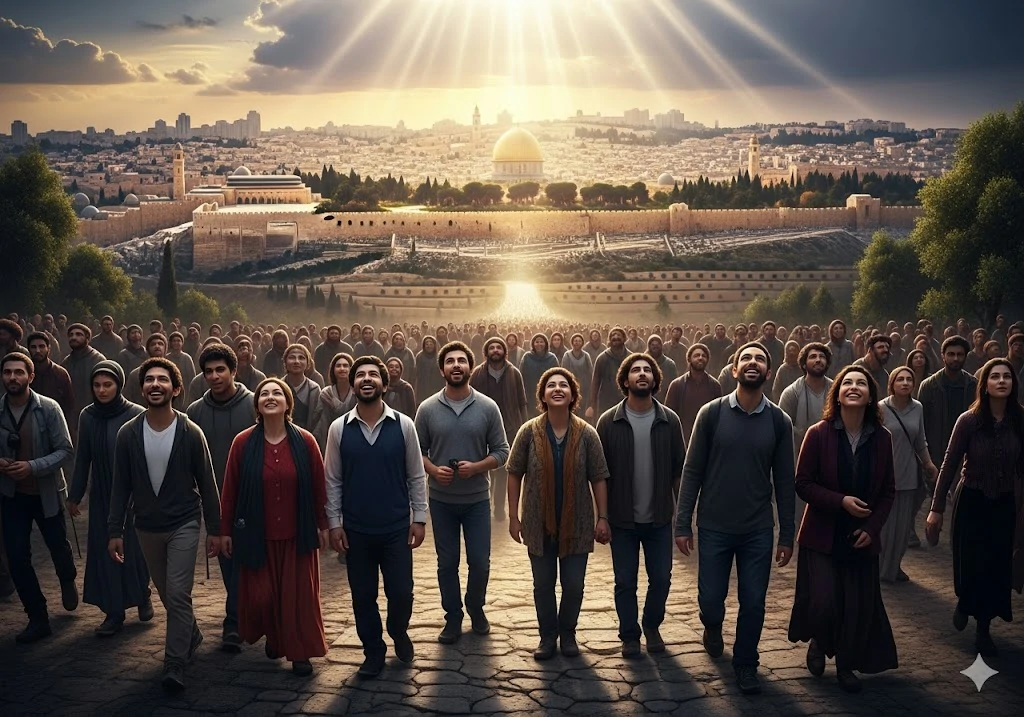 Uma multidão diversificada de várias nações caminha com admiração e esperança em direção a Jerusalém, banhada por uma radiante glória divina que desce do céu. Fonte: IA